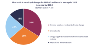 Figure: Most critical security challenges for EU DSO resilience in average in 2025 (assessed by DSOs). Data based on a survey conducted in DSO Entity’s CEG in 2025.